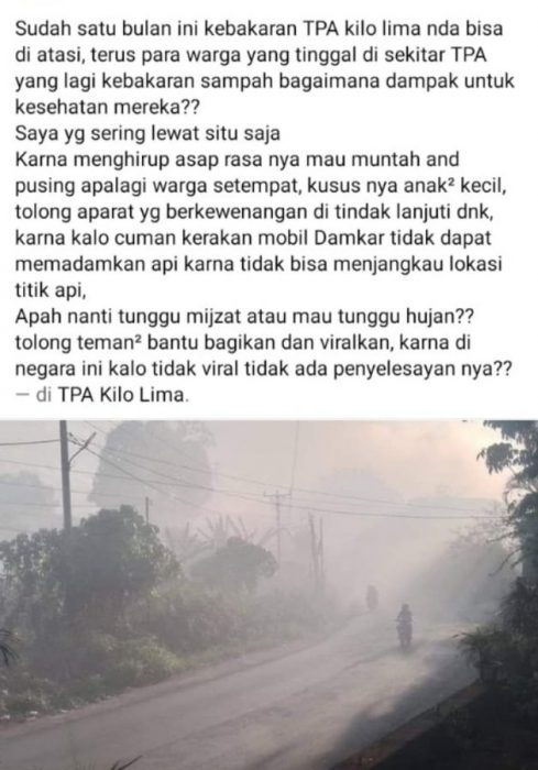 Sebuah keluhan massal meluap di media sosial, khususnya dalam sebuah grup Facebook, membeberkan ketidakpuasan warga setempat terhadap penanganan kebakaran yang sudah berlangsung selama sebulan penuh. Para warga mengeluhkan bahwa upaya penanggulangan dari pihak berwenang, terutama mobil pemadam kebakaran, tidak mampu menjangkau titik api, meninggalkan mereka terpapar asap yang bisa menyebabkan penyakit ISPA