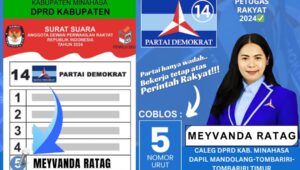 Minahasa – dibalikfakta.com – Caleg DPRD dari partai Demokrat nomor urut 5 Dapil 5 Kabupaten Minahasa mencakup Kecamatan Mandolang, Tombariri dan Tombariri timur Meyvanda Ratag, memiliki visi dan misi kuat untuk melayani masyarakat dengan tulus dan ikhlas. Dengan komitmen yang tinggi dengan mengawal pemerintahan yang bersih dan adil demi mewujudkan masyarakat yang sejahtera.
