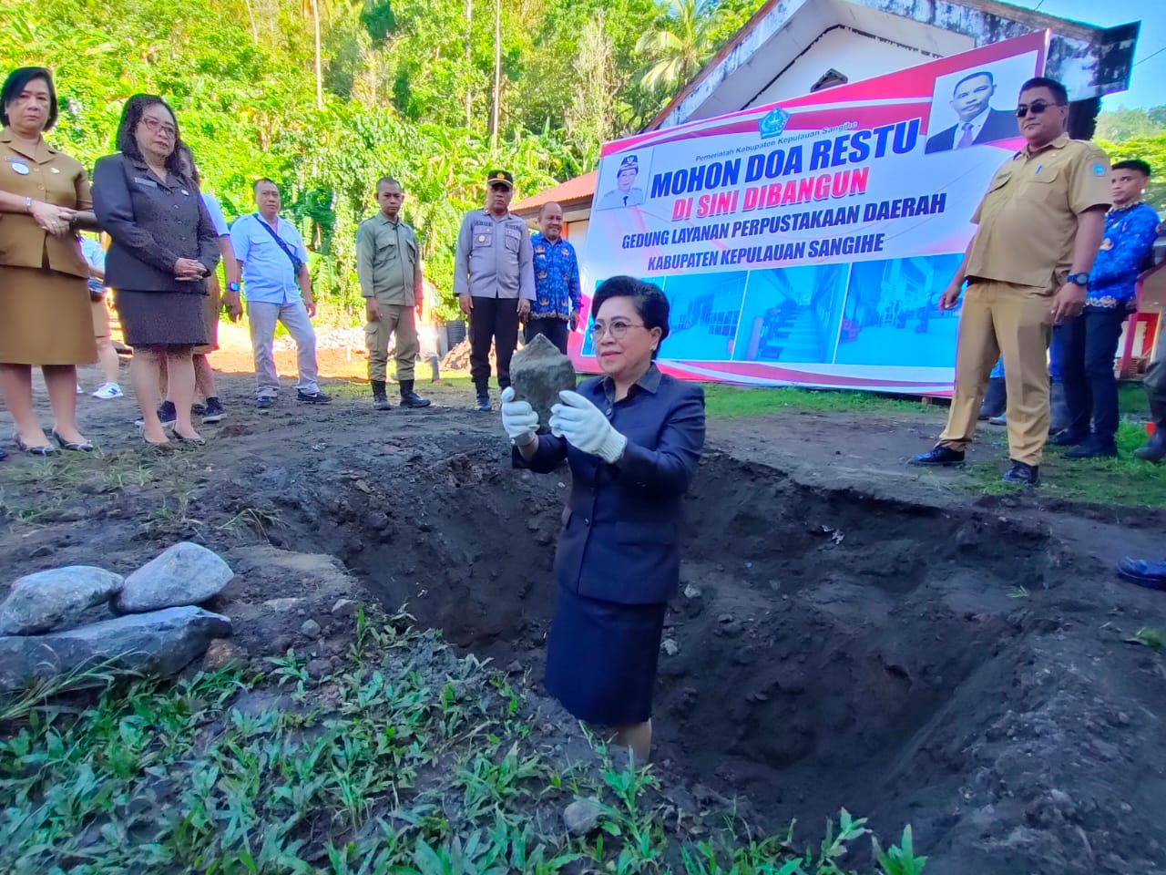 Penjabat Bupati Kabupaten Kepulauan Sangihe dr Rinny Tamuntuan yang juga secara langsung meletakan batu dasar dalam Tahapan pembangunan Gedung layanan perpusatakan daerah dalam sambutannya mengatakan, peletakan batu dasar ini adalah simbol optimisme dalam membangun sumberdaya yang lebih baik.