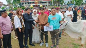Wali Kota Manado Andrei Angouw didampingi Ketua TP PKK Kota Manado menyerahkan secara simbolis beberapa ekor sapi qurban di lapangan Sparta Tikala Manado, Sabtu (15/06/24).