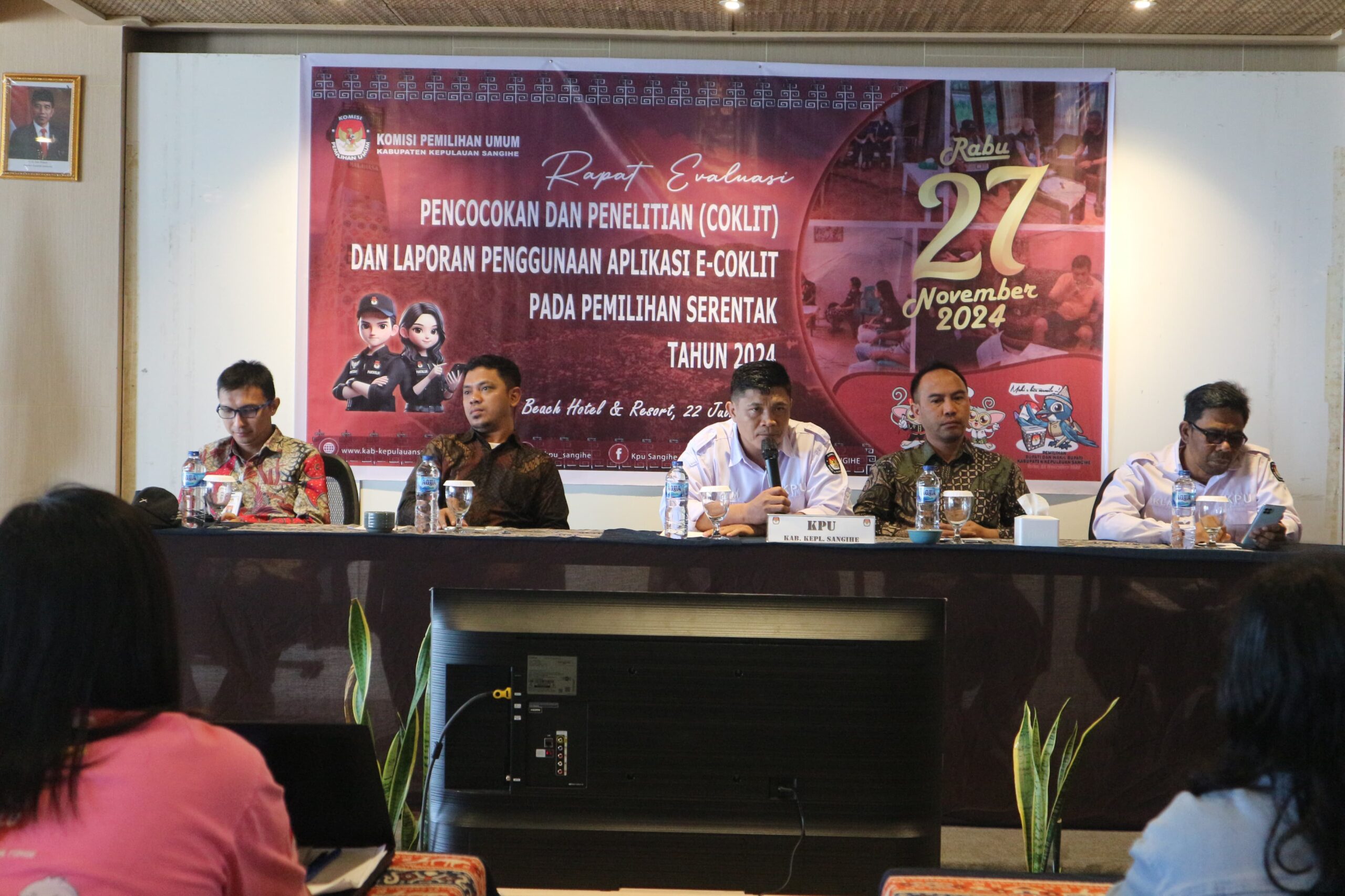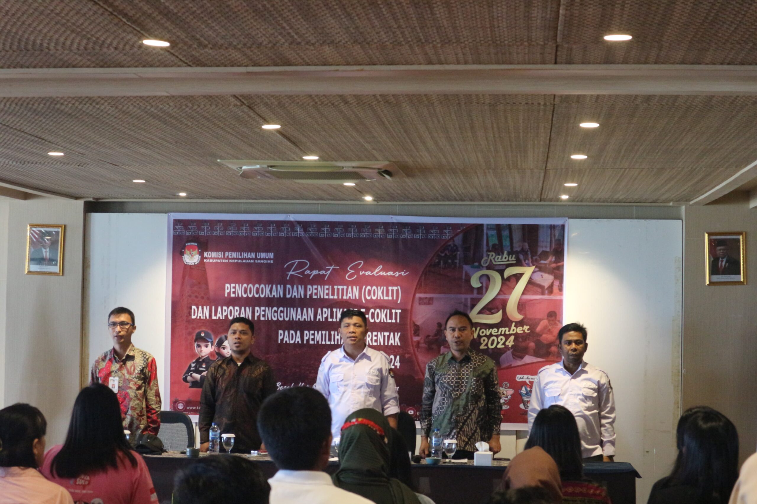 Sangihe, Dibalikfakta.com – Senin (22/7/24) Komisi Pemilihan Umum Kabupaten Kepulauan Sangihe laksanakan Rapat Evaluasi Pencocokan dan Penelitian ( Coklit) serta Laporan Penggunaan Aplikasi E- Coklit pada Pemilihan Serentak Tahun 2024 di Tahuna Beach Hotel.