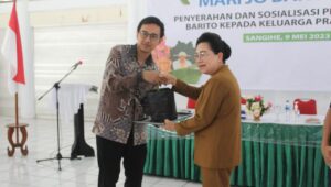 Sangihe – Dibalikfakta.com – Penyerahan dan Sosialisasi Perawatan Bibit barito kepada keluarga prasejahtera dilakukan oleh penjabat Bupati Kepulauan Sangihe, dr.Rinny Tamuntuan secara simbolis kepada warga pada hari Selasa (9/5/2023) di Pendopo rumah jabatan Bupati Sangihe.
