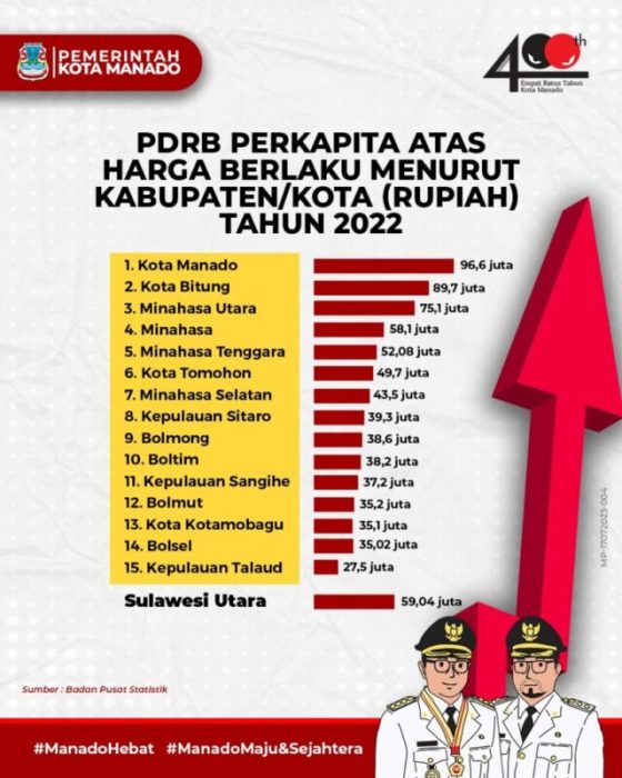 Bahkan kota tinutuan ini berhasil melampaui nilai provinsi Sulawesi Utara, yaitu Untuk provinsi Sulawesi Utara sendiri income per kapita 59,04 juta, atau sekitar Rp4,9 juta per bulan rata-rata pendapatan setiap kepala keluarga.