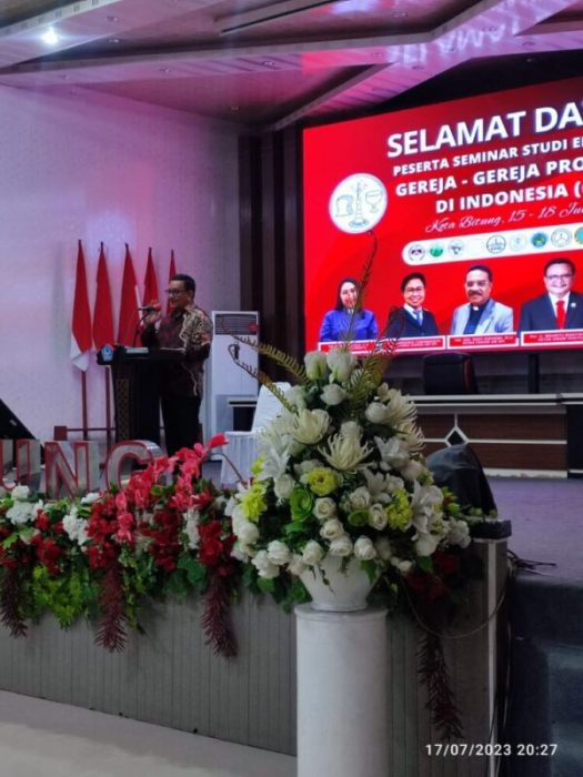Wali Kota Bitung Pnt. Ir. Maurits Mantiri, MM, atas nama Gubernur Provinsi Sulut Olly Dondokambey menutup pelaksanaan Seminar Studi Eklesiologi GPI, Senin (18/7/2023).