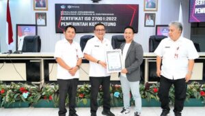 Wali Kota Bitung Ir. Maurits Mantiri MM didampingi Sekertaris Daerah Ir. Ignatius Rudy Theno ST MT menerima Sertifikat ISO 27001 versi 2022 yang di serahkan oleh Siber Security Indonesia kepada pemerinrah Kota Bitung, Rabu (26/07/2023).