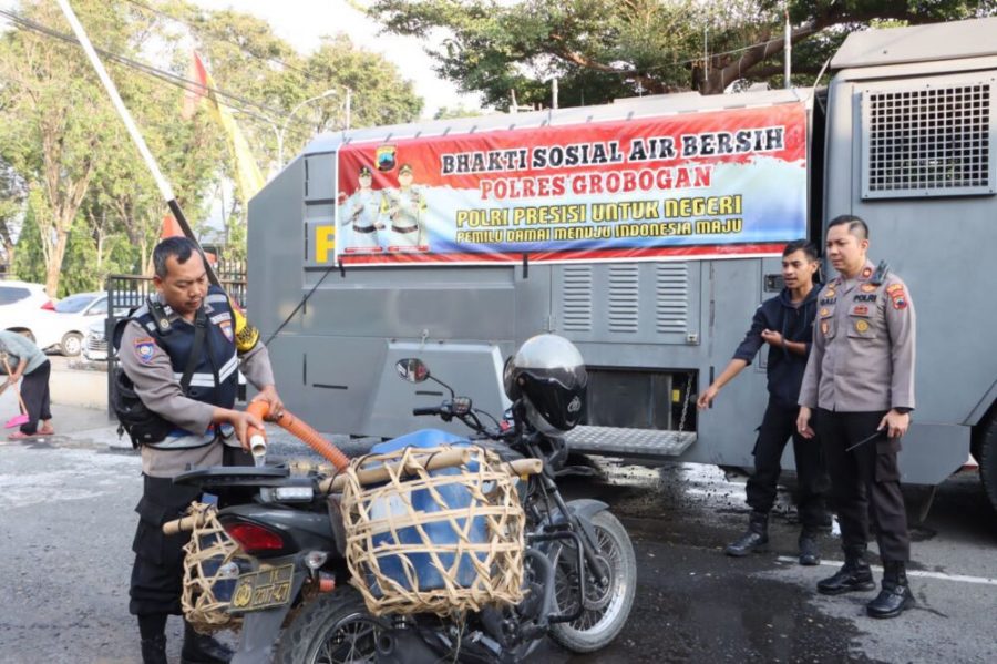 Kapolres Grobogan AKBP Dedy Anung Kurniawan saat penyaluran bantuan air bersih mengerahkan 1 mobil water cannon yang biasa dipakai menghalau massa saat aksi demonstrasi, 4 mobil tangki, 4 mobil patroli yang telah dimodifikasi, dan 50 anggota Bhabinkamtibmas dengan motor bronjong berisi air bersih. Menurutnya, dalam mengatasi kekeringan yang terjadi di wilayah Grobogan, pihaknya juga telah melakukan koordinasi dengan BPBD dan PDAM Grobogan.