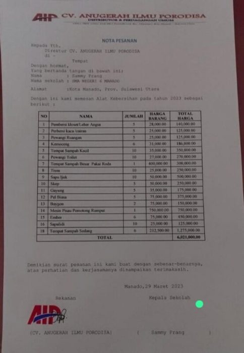 Manado — Dibalikfakta. Com – Sekolah Menengah Atas (SMA) Negeri 6 Manado, diduga melakukan Mark Up harga pada pembelian ATK melalui CV Anugerah Ilmu Porodisa, dari penelusuran awak media bahwa Kepala Sekolah SMA 6 Manado Sami Prang, memesan alat kebersihan Kepada CV tersebut dengan harga yang fantastis.
